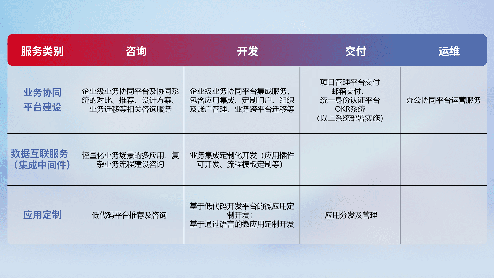 针对钉钉、、、企微、、、IDaas等平台级产品提供产品的规划、、、方案、、交付、、定制化开发等服务,,,,实现如统一协同办公、、、智能客户服务、、混合会议管理、、智能数据查询、、等业务场景,,,,实现数字化转型。。。。